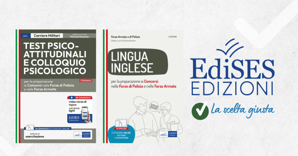 Per prepararti è disponibile il manuale EdiSES per la preparazione alle prove psico-attitudinali previste dai concorsi nelle Forze Armate e Forze di Polizia e il manuale di lingua inglese per i concorsi nelle Forze Armate.