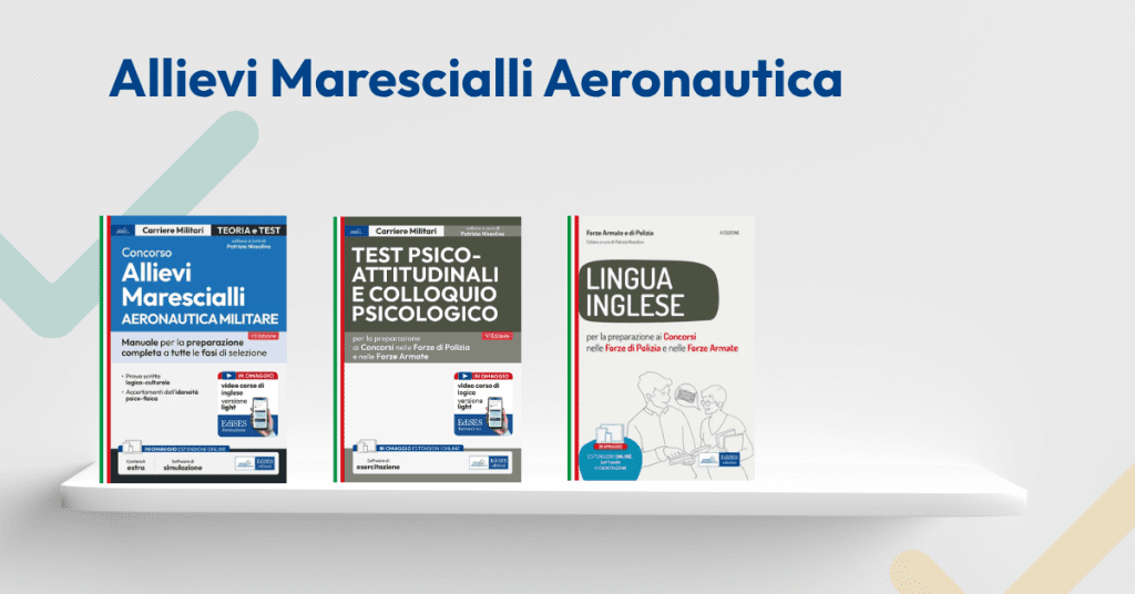 Per lo studio degli argomenti previsti dalle prove di selezione è disponibile il Manuale EdiSES dedicato ai Concorsi per Allievi Marescialli nell’Aeronautica Militare. Incluso con il testo il software di simulazione, per esercitarsi online infinite volte, e il corso di inglese versione light per addentrarsi in una delle materie previste dalla prima prova di selezione.