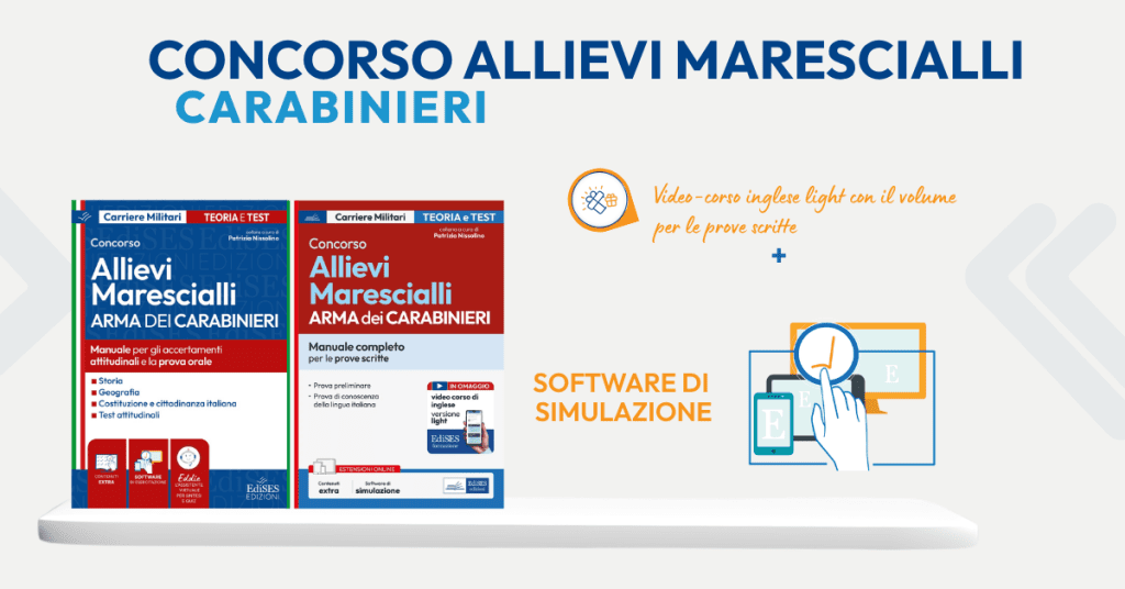 Per la preparazione alla prima fase di selezione (e non solo) del concorso per Allievi Marescialli Arma dei Carabinieri è disponibile il Manuale EdiSES che affronta tutti gli argomenti previsti dal bando. Tra le estensioni del volume sono presenti sei simulazioni delle prove d’esame permettono di esercitarsi in vista del concorso.