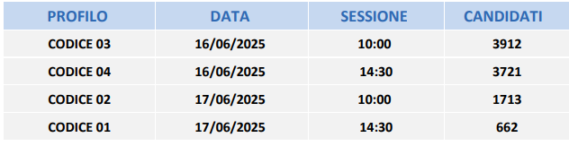 I candidati sono chiamati a sostenere il test nei giorni 16 e 17 giugno 2025 presso la Nuova Fiera di Roma. Nello specifico: